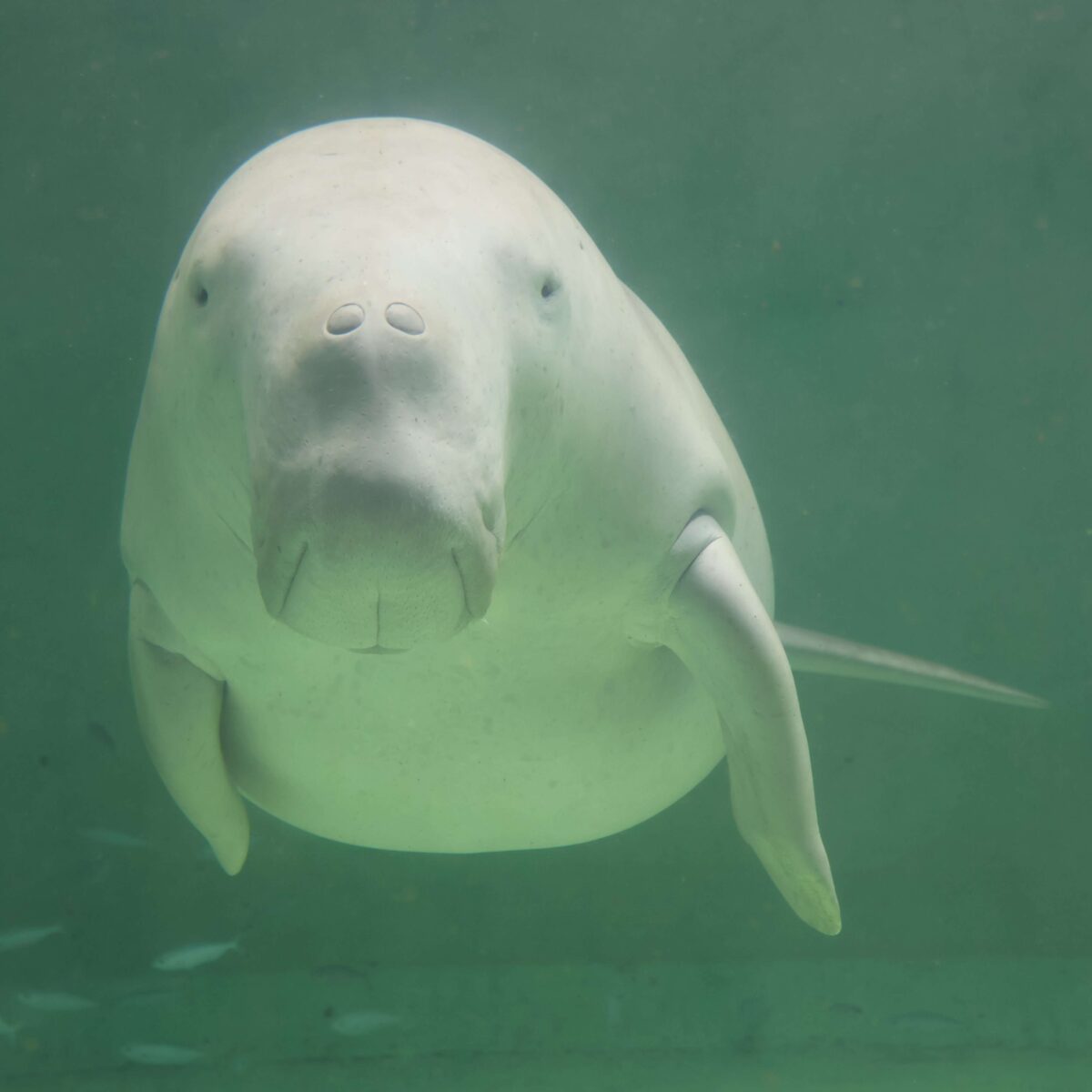 ジュゴン(学名:Dugong dugon)とは、哺乳綱カイギュウ目(海牛目)ジュゴン科ジュゴン属に属し、体長3m、体重450㎏にもなる大型海生哺乳類です。浅い海底でゆっくりと動きながらアマモなどの海藻を食べて暮らしています。海に住む哺乳類ですが、イルカやクジラなどの鯨類(鯨偶蹄目)ではなく、全く別の分類(海牛目)となっています。