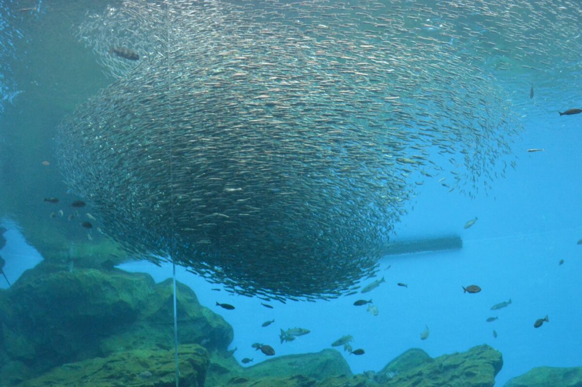 イワシって魚が弱いで鰯って漢字で書くんですけど大きな群れをつくることによって捕食者に自分たちが大きい魚であるように見せかけて威嚇して狙われる確率を下げたり、遊泳効率を高める効果があるんですよね!!