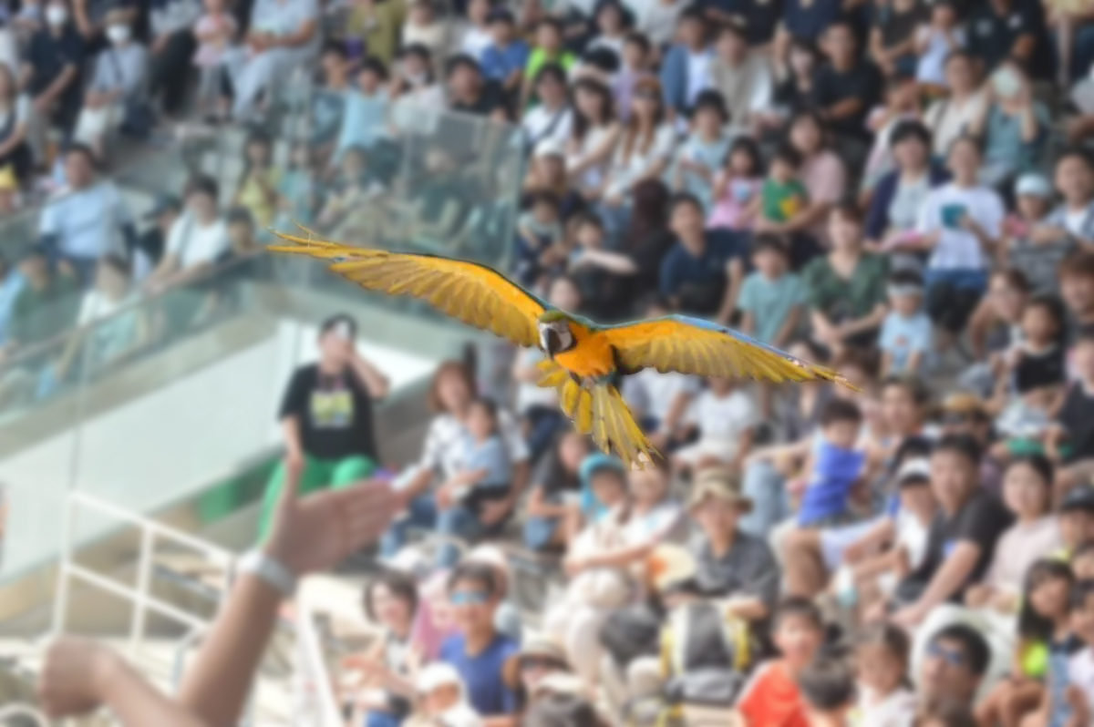 羽ばたいてきたルリコンゴウインコが無事に飼育員さんの手に着陸しました。自前の一眼レフカメラに望遠レンズを装着して撮影したのですが、動きが速かったのでシャッタースピードを上げて何とか捉えました。空飛ぶインコの撮影は難しかったです笑