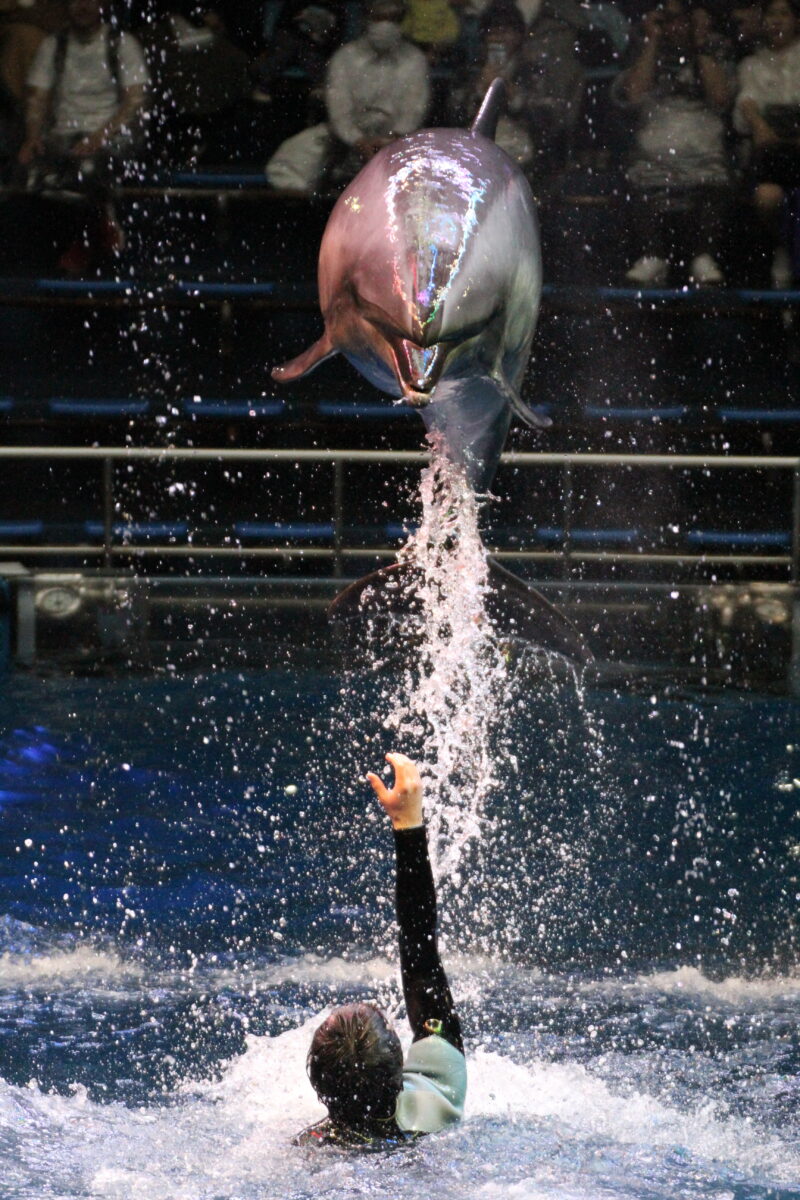 ショーでは、イルカたちが次々と多くの技を披露します。アクアパーク品川では バンドウイルカ、オキゴンドウ、カマイルカ の3種が飼育されており、それぞれの種の特性を生かしたパフォーマンスが組み込まれている点も見どころです。スピード感のある動き、力強いジャンプ、安定した演技など、種類ごとの違いが分かりやすく表現されています。観客席との距離も近く、特に夏場は前方の席では水しぶきがかかります。というかかけてきます。