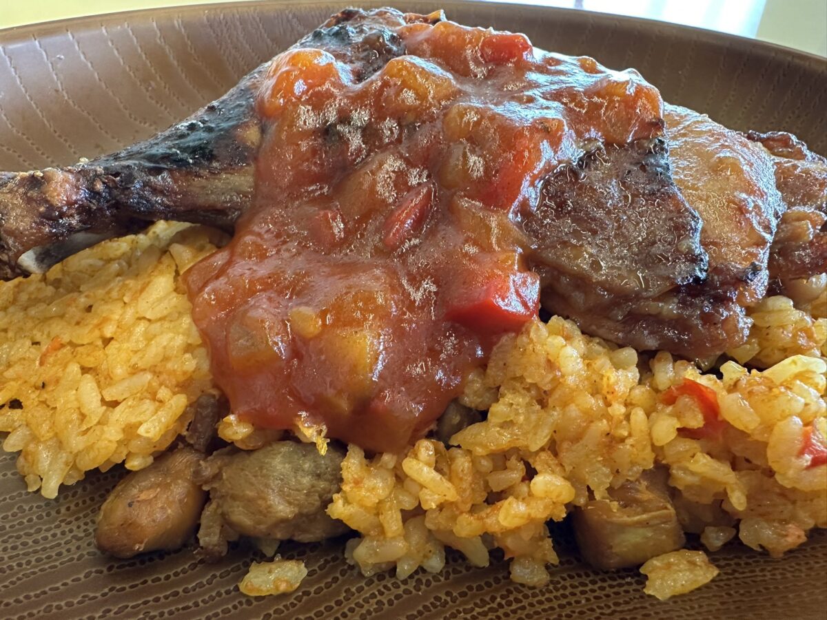 多摩動物公園サバンナキッチンの【ジョロフライス】 トマトベースのピラフに骨付きチキンが乗ったボリューミーな一皿! チリビーンズとトマトソースが優しい味わいのガーナの国民食です