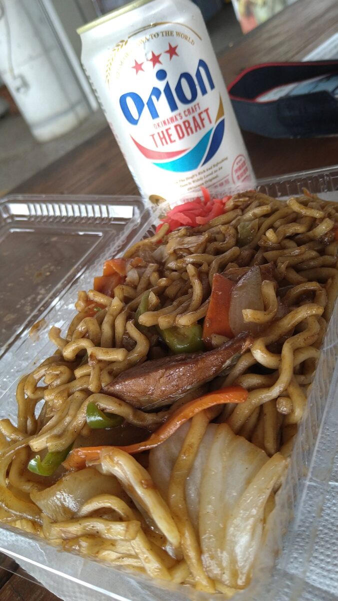 沖縄のこどもの国で食べた ウェルカムパーラーの 沖縄そばの麺の焼きそばwithオリオンビール