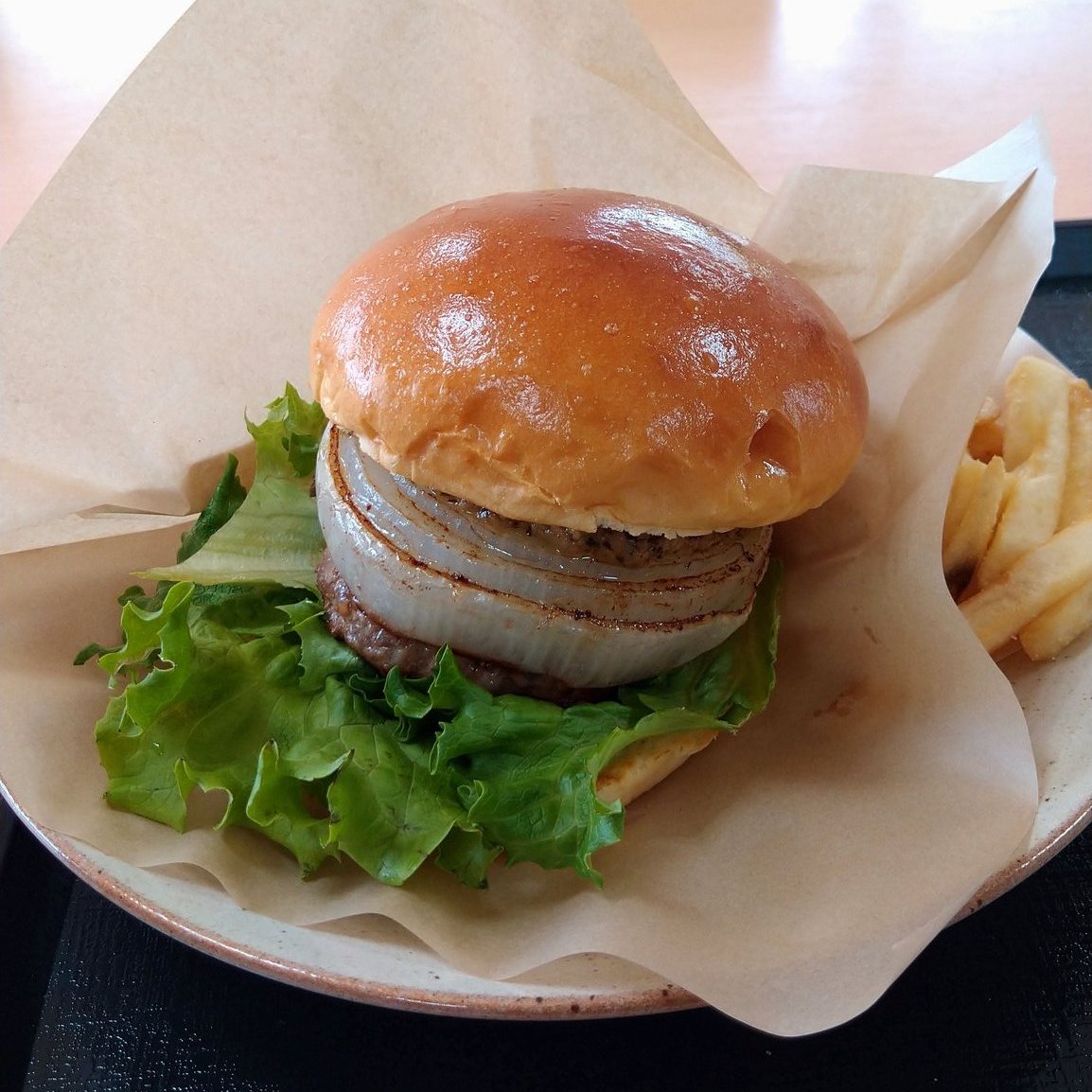 淡路ファームパーク イングランドの丘 (兵庫県南あわじ市) 島チーズバーガーセット(ポテト+ドリンクバー)で1,800円です。淡路島玉ねぎの甘みのあるソースです。玉ねぎが有名な淡路島なので、玉ねぎメニューが多いです。