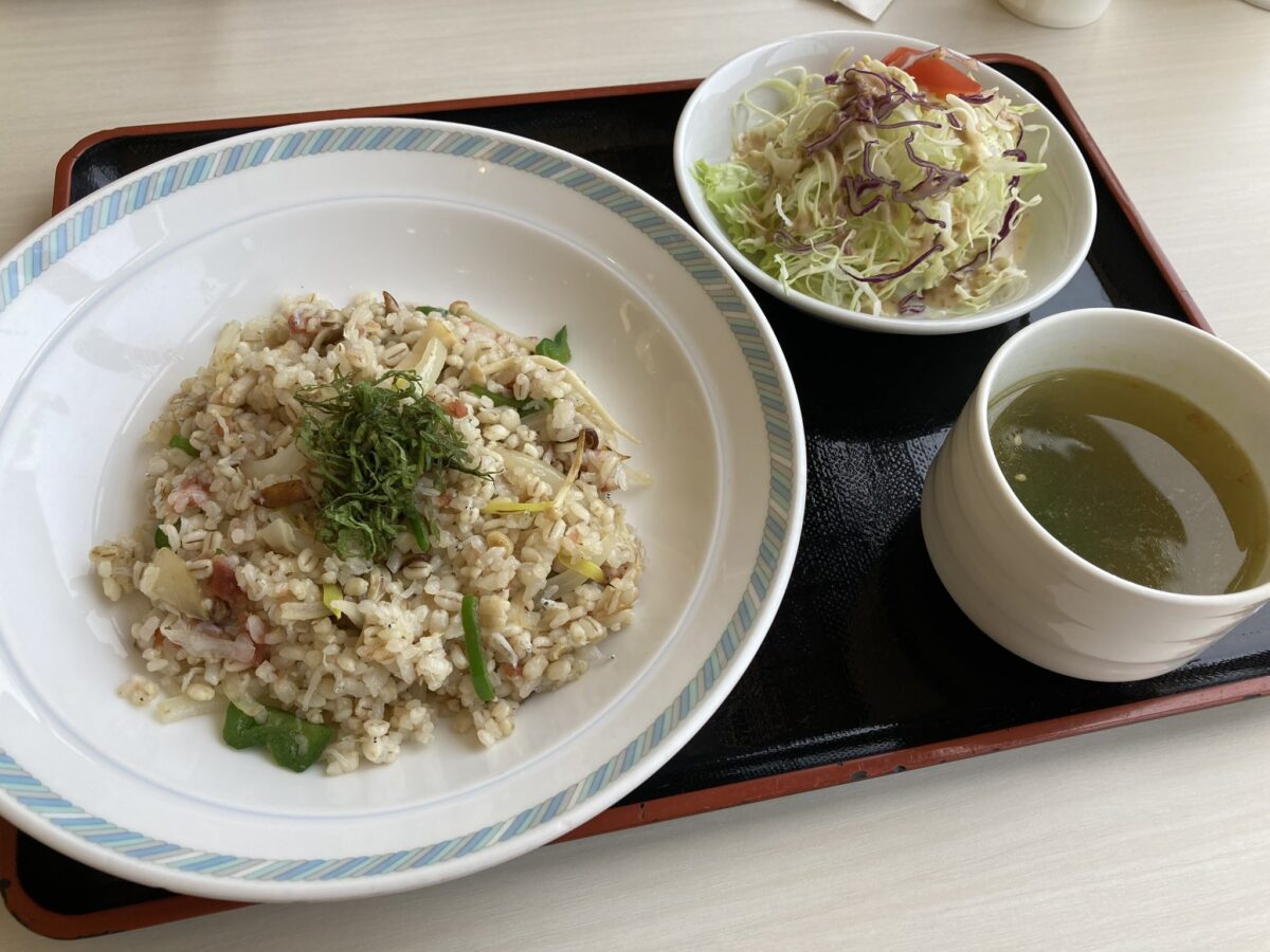 とべ動物園 裸麦と梅のピラフ 680円 カレーやパスタ等が多い中、かなり渋めのメニューかつ非常にお安いのが魅力的。 具材もねぎ、じゃこ、キノコ3種と豊富で美味しく、スープとサラダがついてこのお値段!