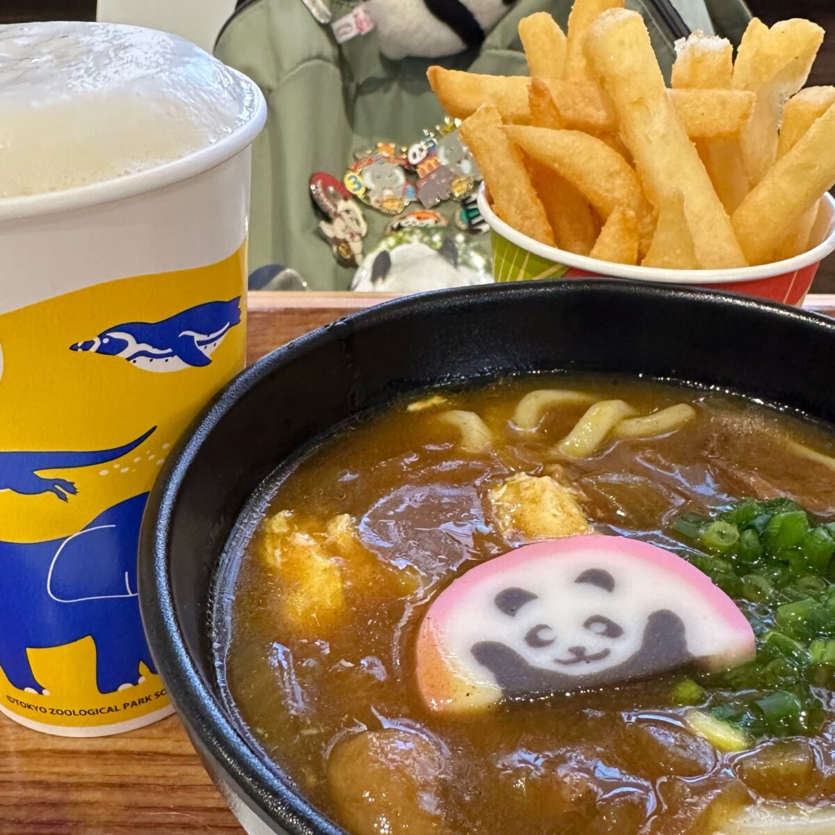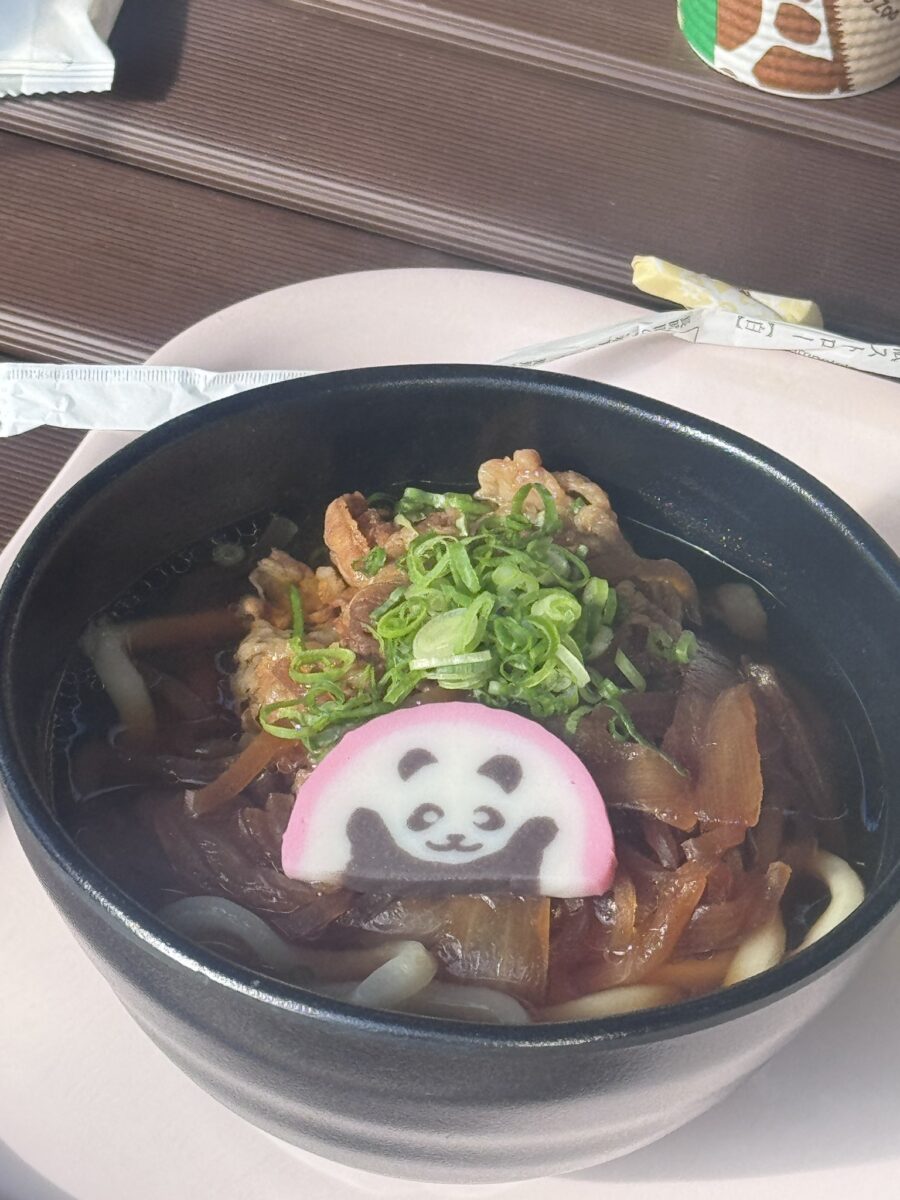上野動物園の牛肉うどん。 素朴な甘辛さがちょうど良く、寒い冬にピッタリです。 パンダのかまぼこもかわいい