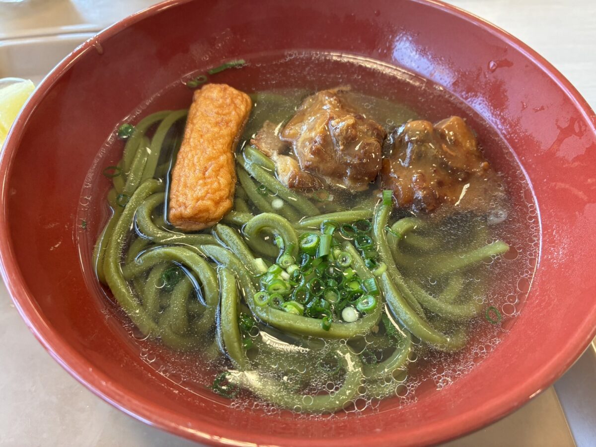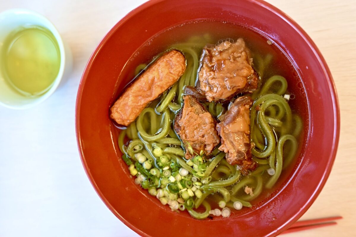 鹿児島市平川動物公園のサイゴうどん、鹿児島茶を練り込んだ緑色のうどん麺に、郷土料理である豚軟骨の味噌煮をトッピングした鹿児島ならではのメニューです! 豚軟骨が溶け合うお出汁はコクがあってとっても美味しい!麺はお茶の渋みも感じられて、1杯で色んな味を楽しめます